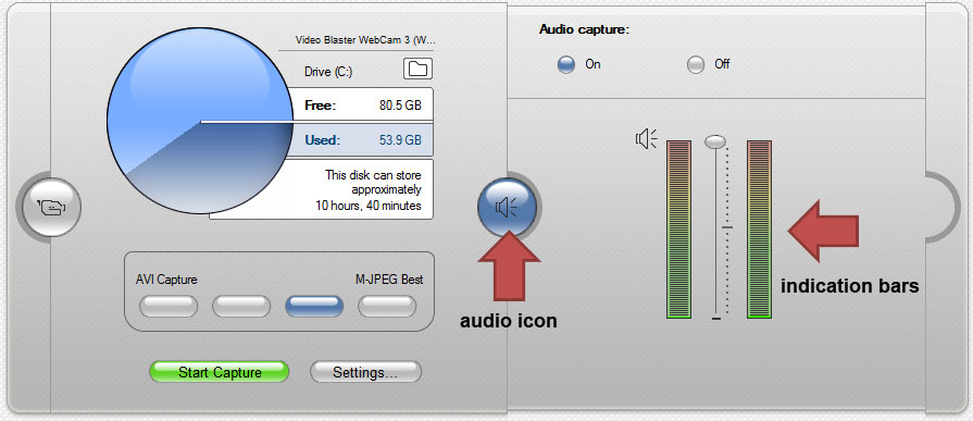 - You can check the audio input level by clicking on the audio icon and then speaking into the mike. Watch the 2 indication bars to see what is an optimal speaking volume.